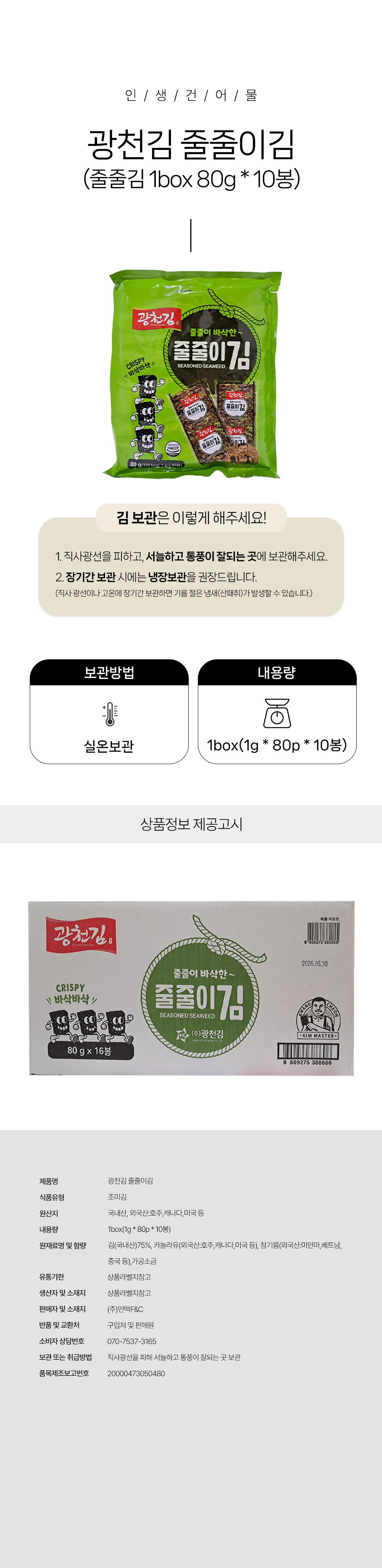 [박스무배] 광천김 줄줄이김 1box(1g*80p*10봉)