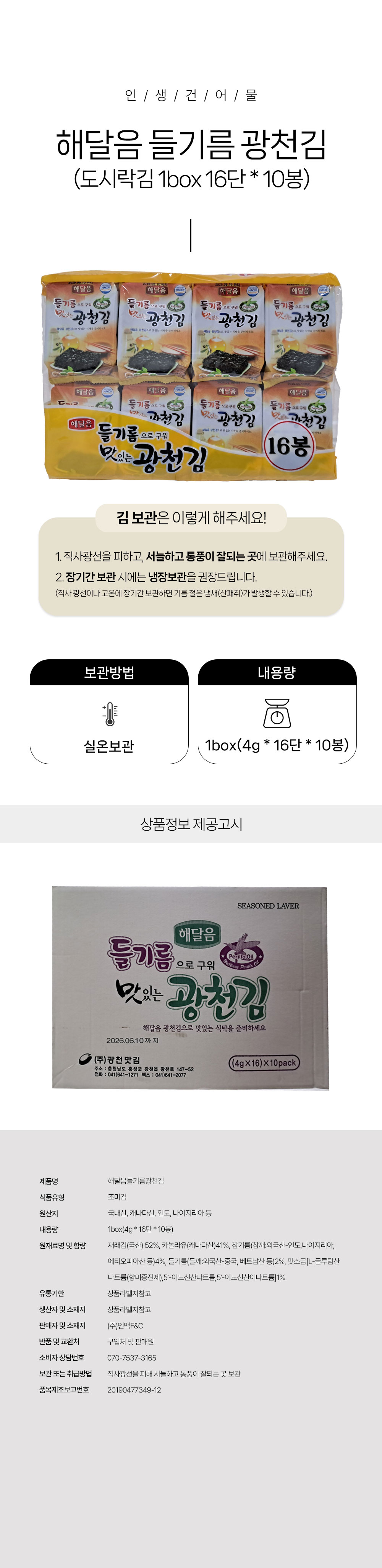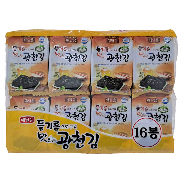 [박스무배] 해달음 들기름 광천김 도시락김 1box(4g*16단*10봉)